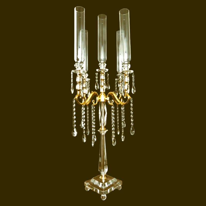Elegant crystal and silver mixed candelabra with nine gold branches and nine screwed hurricanes. Assembles and disassembles in less than 10 minutes each, no tools are required. It is ideal to use it for a wedding or party centerpiece.